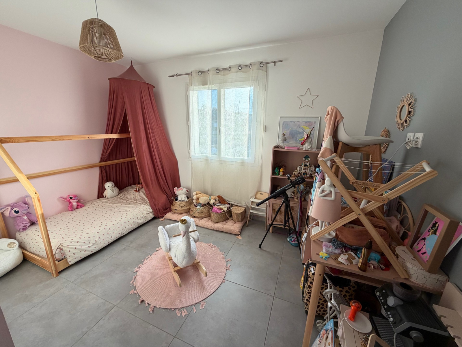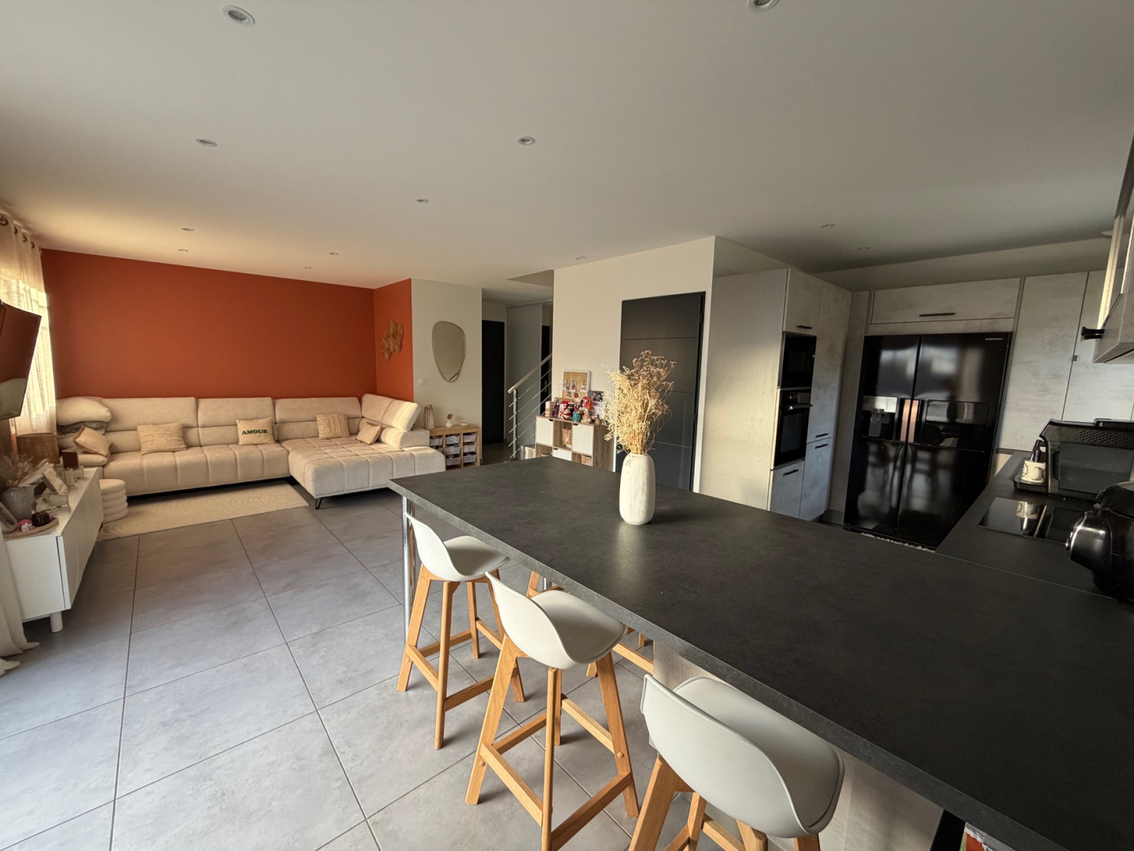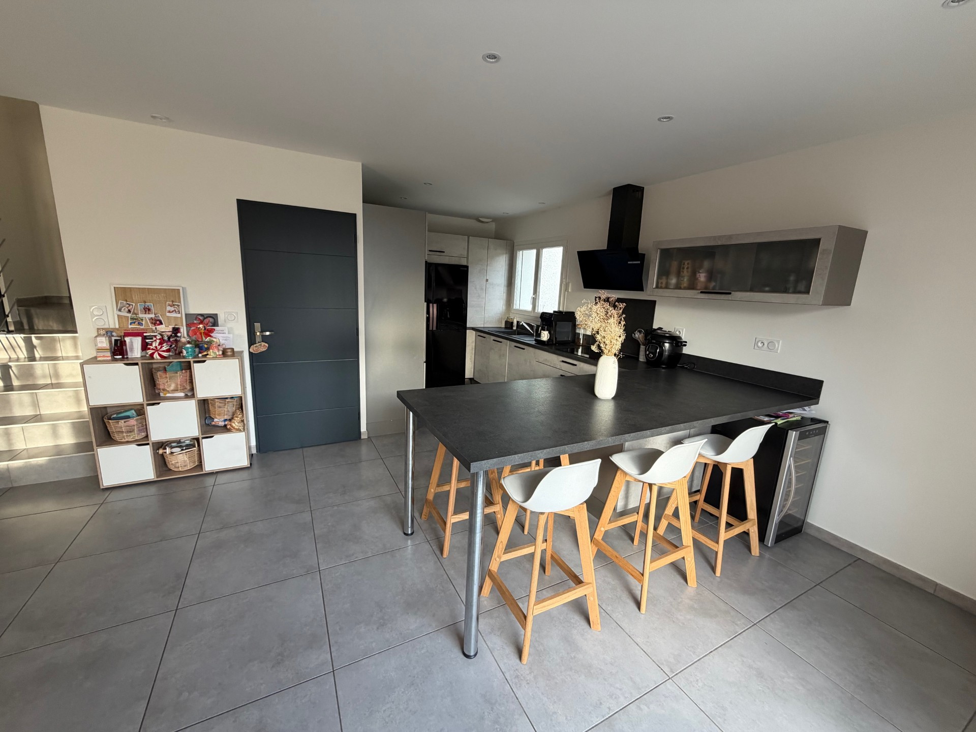 Elle se compose au rez-de-chaussée d'une cuisine équipée ouverte sur le salon séjour, un cellier et un wc. A l'étage, l'espace nuit avec 3 chambres, un wc et une salle de bain. Le bien possède également un garage et des places de sationnement extérieur.